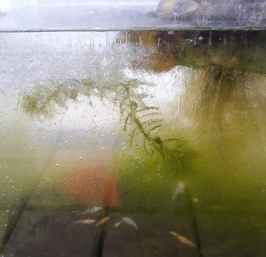 下は我が家の真冬の水槽。氷の下でちゃんと生きていて、春になると動き出します。