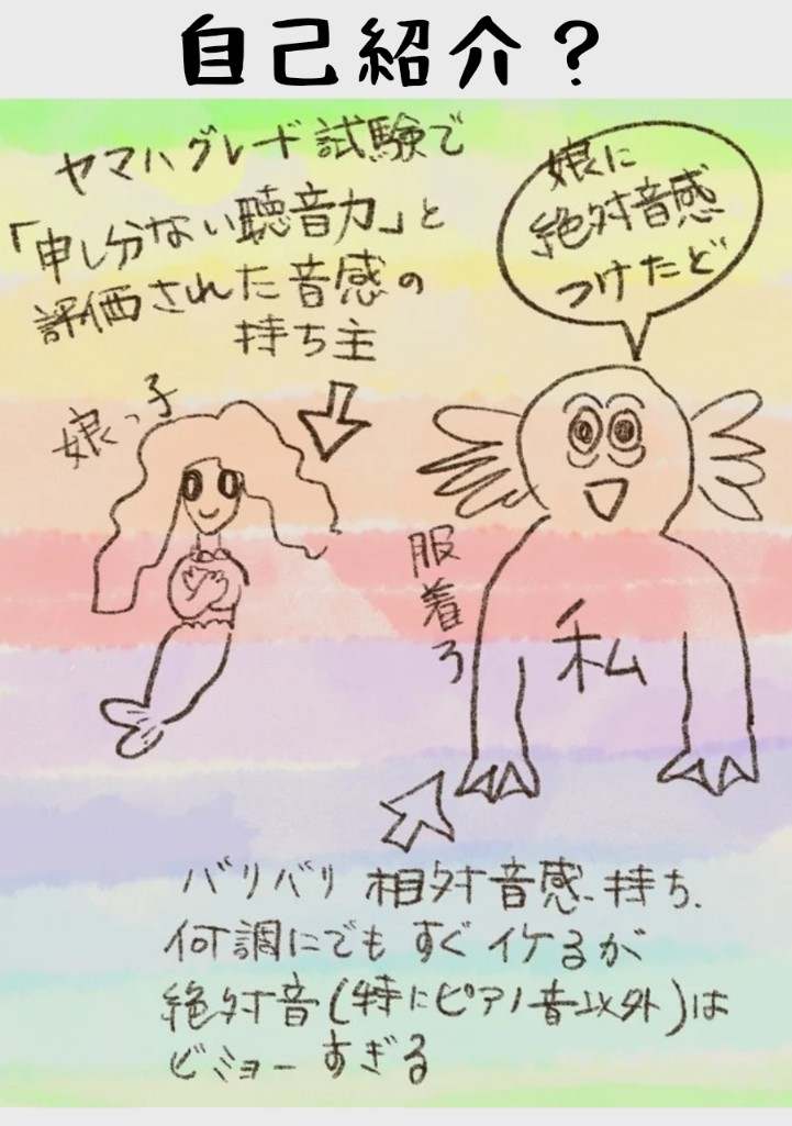 今は成長した、自分の子供の音感と比べると(実際の個人の感覚は、もちろん体験できませんが)、ステージが違うのが分かります。子どもは、基準音がなくても、聞こえる音楽の調性が分かります。
